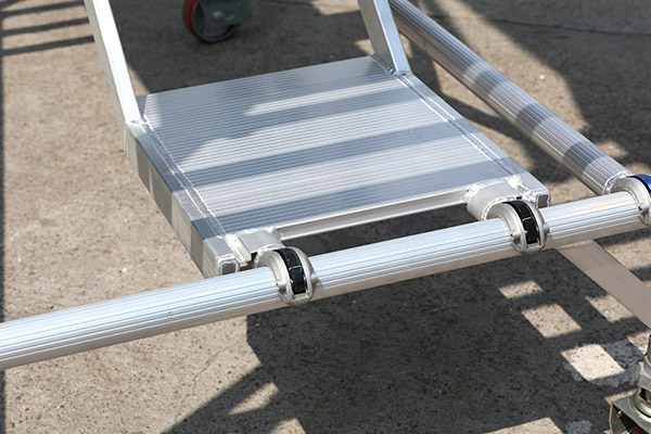 底部加装脚轮调节杆,可以根据地面平整度调节大约30CM的落差。采用高强度,耐腐蚀铝合金材料